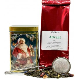 Advent; Svart te, kanelbitar, apelsinskal och hibiscus. Smaksatt med krydd, kanel och mandelarom.