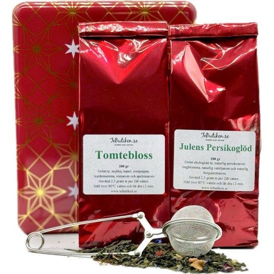 En röd Julburk, 1 hg grönt te Tomtebloss, 1 hg grönt te Julens Persikoglöd och en tesil.