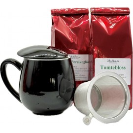 En svart mugg med insatssil, 1 hg grönt te Tomtebloss och 1 hg grönt te Julens Persikoglöd.