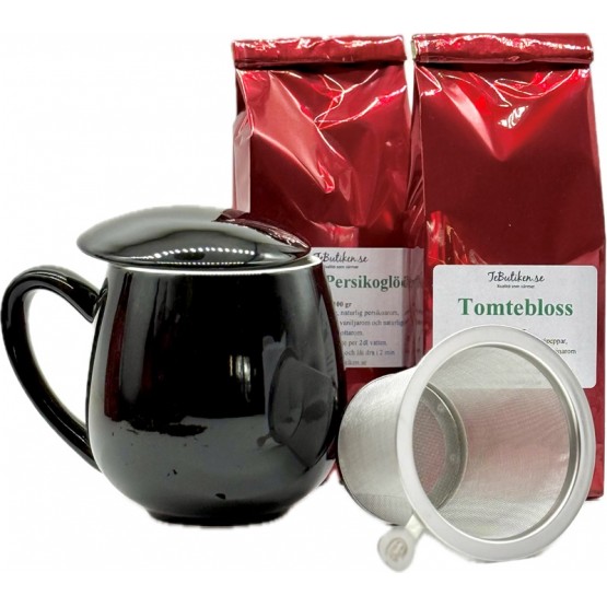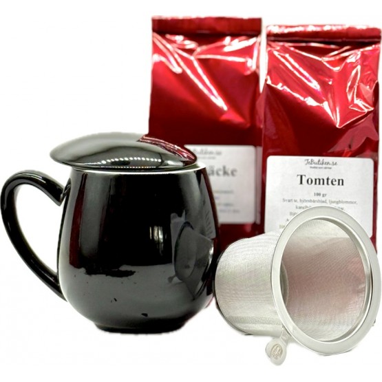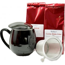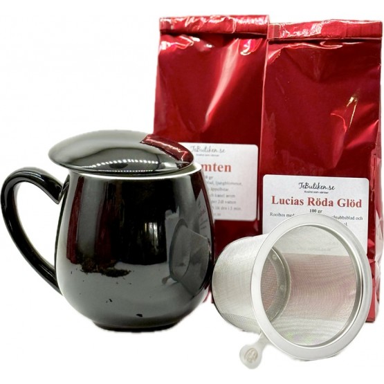 En svart mugg med insatssil, 1 hg rooibos Tomtens te, 1 hg rooibos Lucias Röda Glöd.