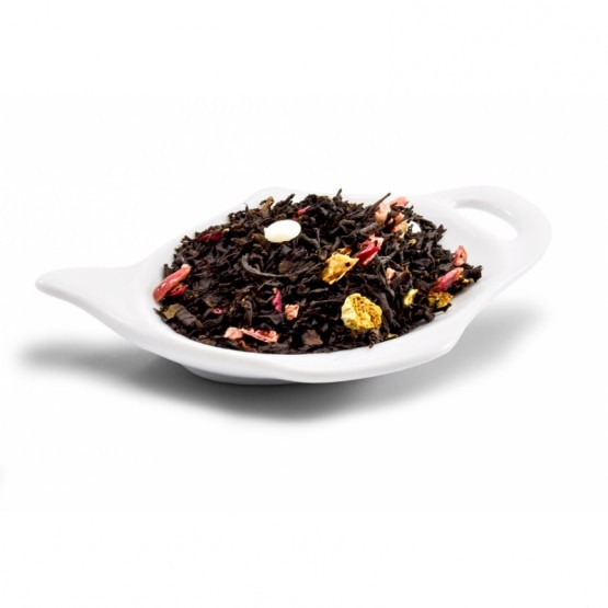 Svart te från Kina smaksatt med fläder-, cream- och kvittenarom. Dekorerad med sockerhjärtan.