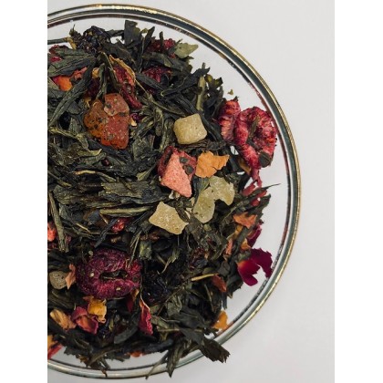 Grönt te, korinter, rosenblad, papayabitar, ananasbitar, jordgubbsbitar och arom.