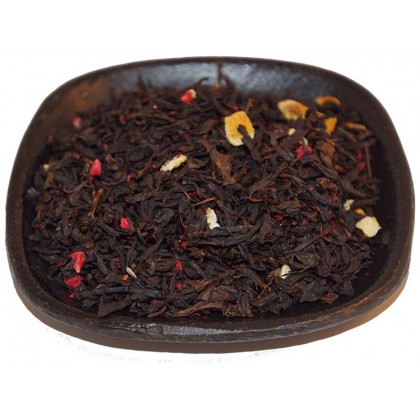 Svart te med hallonbitar, granatäppelblommor, citronskal och arom.