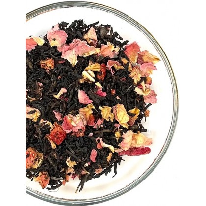 Svart ekologiskt te, rosenblad, jordgubbsbitar och arom.