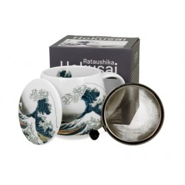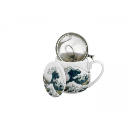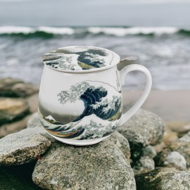 Vacker mugg med tillhörande tesil med mönster "The great wave".