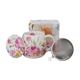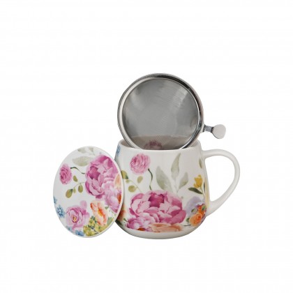 Vacker mugg med tillhörande tesil med romantiskt mönster med blommor.