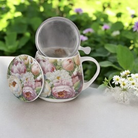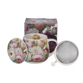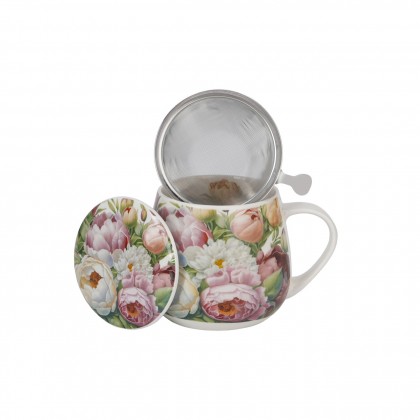 Härlig mugg i modellen Barrel med tillhörande tesil med vackert motiv av pioner i olika nyanser. Förpackad i en vacker presentkartong som matchar muggen.